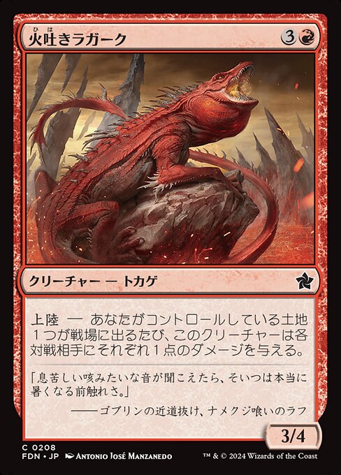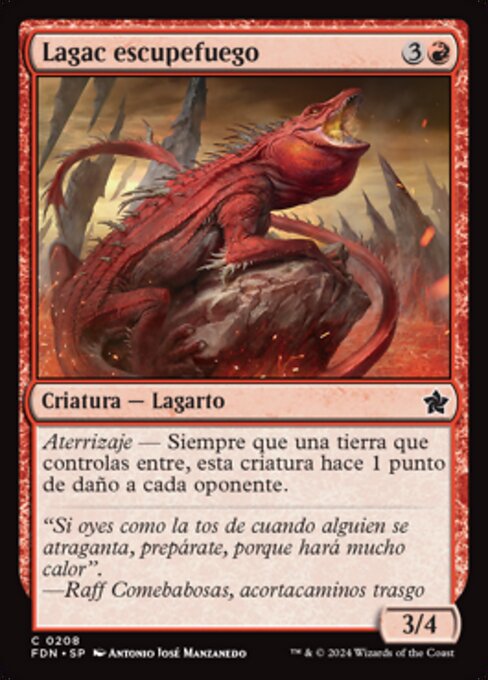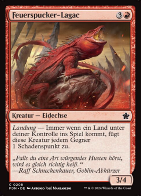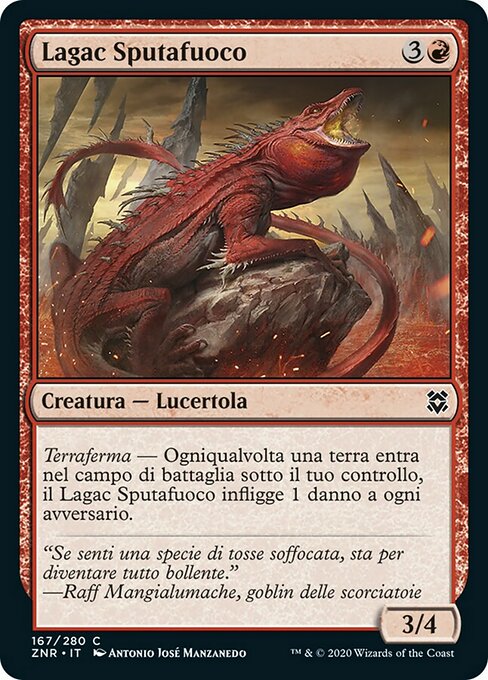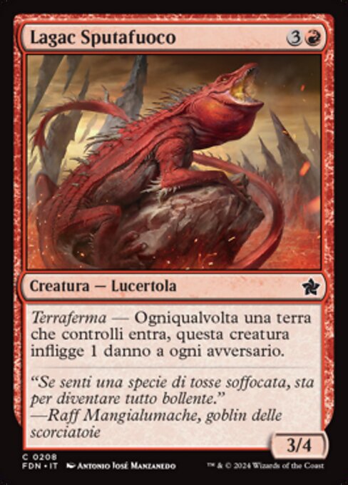![]() Variations— Parts— | Lagac Sputafuoco3 / 4 Terraferma — Ogniqualvolta una terra che controlli entra, questa creatura infligge 1 danno a ogni avversario.
