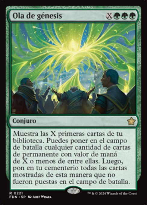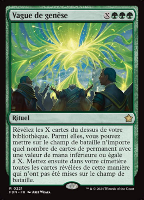 |  Variations : 1Parts— | Flusso d'OrigineRivela le prime X carte del tuo grimorio. Puoi mettere sul campo di battaglia un qualsiasi numero di carte permanente con valore di mana pari o inferiore a X scelte tra quelle carte rivelate. Poi metti nel tuo cimitero tutte le carte rivelate in questo modo che non sono state messe sul campo di battaglia.