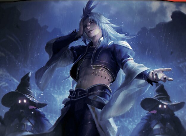 Au début de votre étape de fin, créez un jeton de créature 0/1 noire Sorcier engagé avec « À chaque fois que vous lancez un sort non-créature, ce jeton inflige 1 blessure à chaque adversaire. » Puis, si vous contrôlez au moins quatre sorciers, transformez Kuja.
