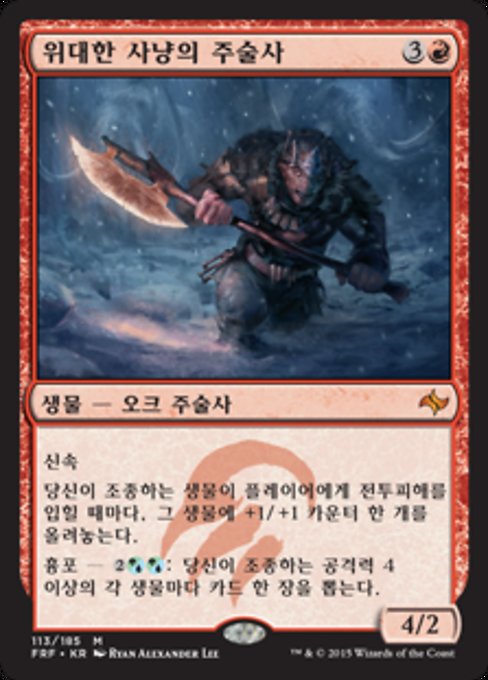 ![]() Variations— Parts— | Shaman of the Great Hunt4 / 2 Haste Whenever a creature you control deals combat damage to a player, put a +1/+1 counter on it. Ferocious —