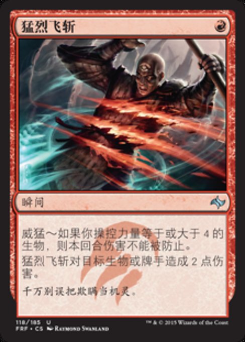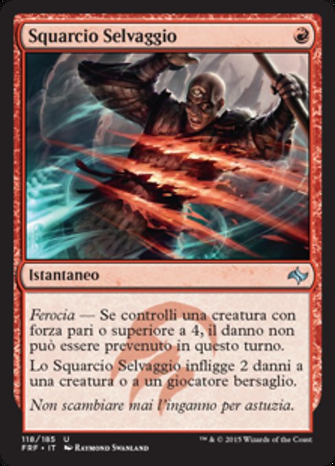 ![]() Variations— Parts— | Wild SlashFerocious — If you control a creature with power 4 or greater, damage can't be prevented this turn. Wild Slash deals 2 damage to any target.