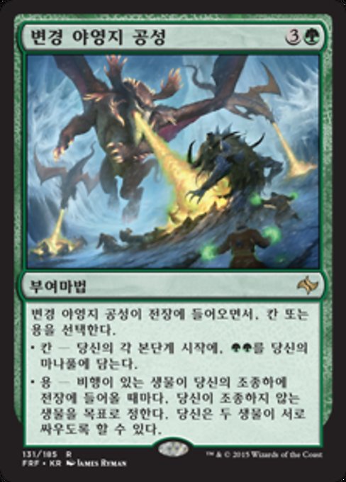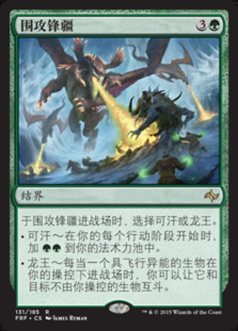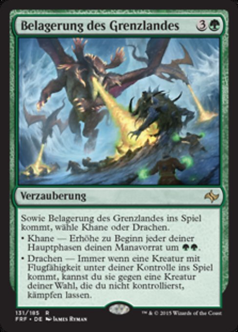 |  Variations : 1Parts— | Frontier SiegeAs this enchantment enters, choose Khans or Dragons. • Khans — At the beginning of each of your main phases, add • Dragons — Whenever a creature you control with flying enters, you may have it fight target creature you don't control.