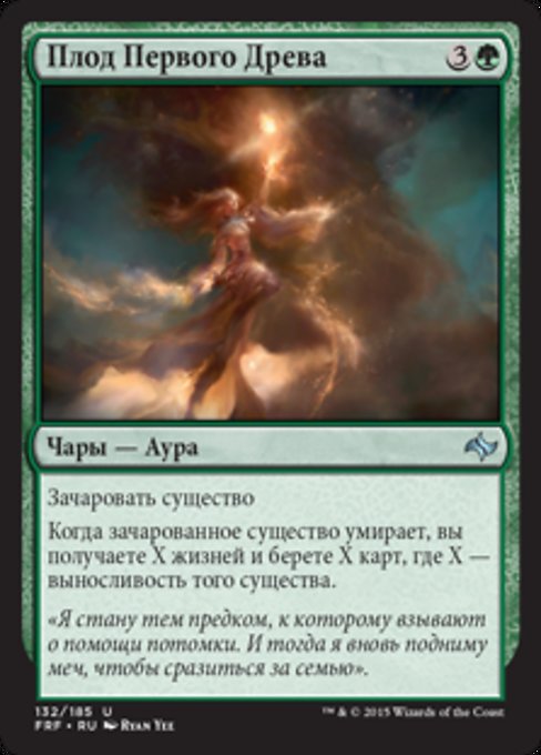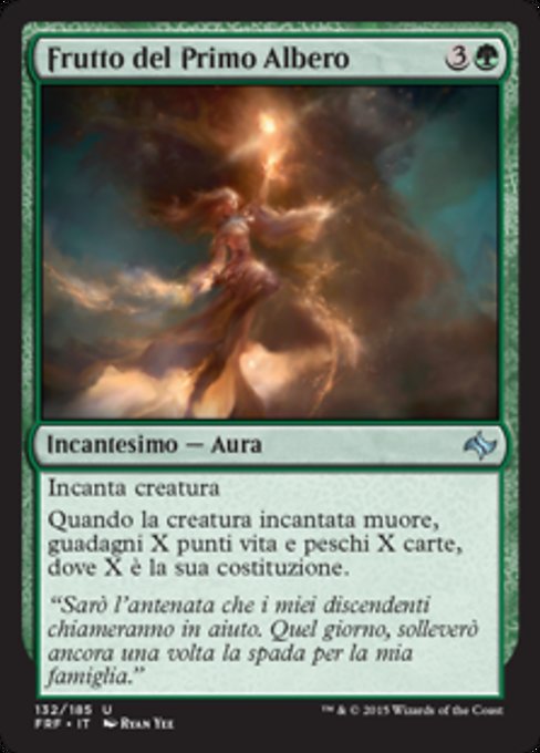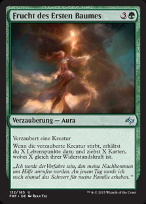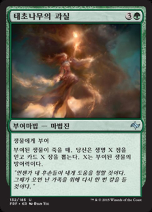 |  Variations— Parts— | Fruit of the First TreeEnchant creature When enchanted creature dies, you gain X life and draw X cards, where X is its toughness.