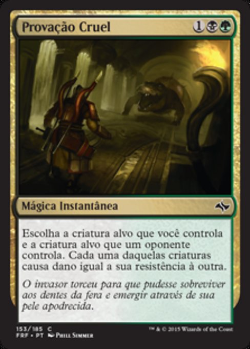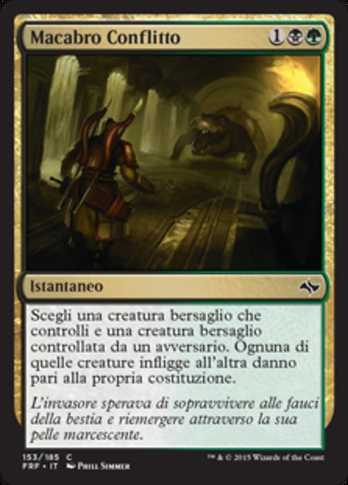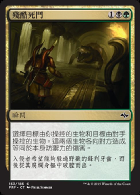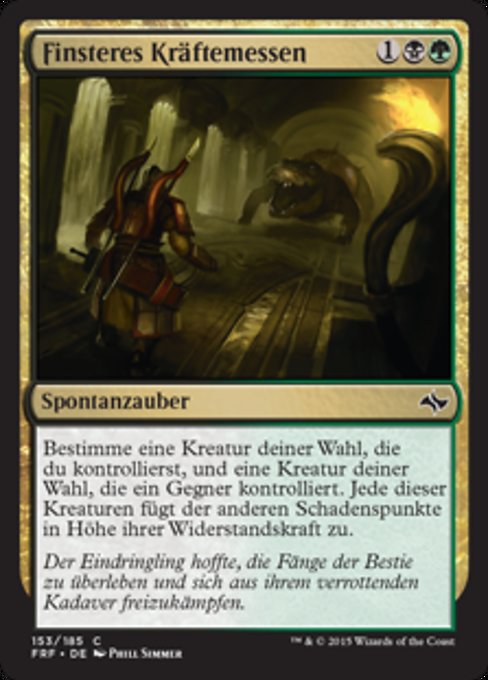 |  Variations— Parts— | Grim ContestChoose target creature you control and target creature an opponent controls. Each of those creatures deals damage equal to its toughness to the other.