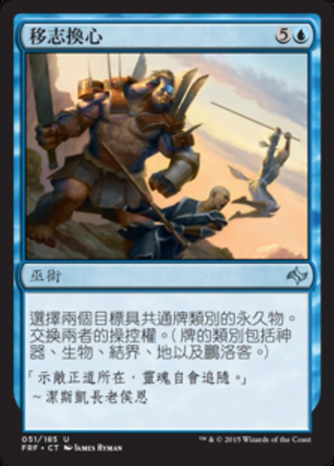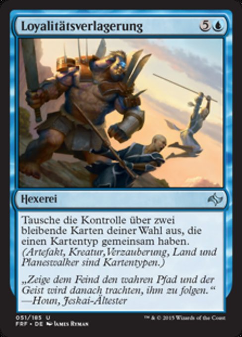 ![]() Variations— Parts— | Shifting LoyaltiesExchange control of two target permanents that share a card type. (Artifact, creature, enchantment, land, and planeswalker are card types.)