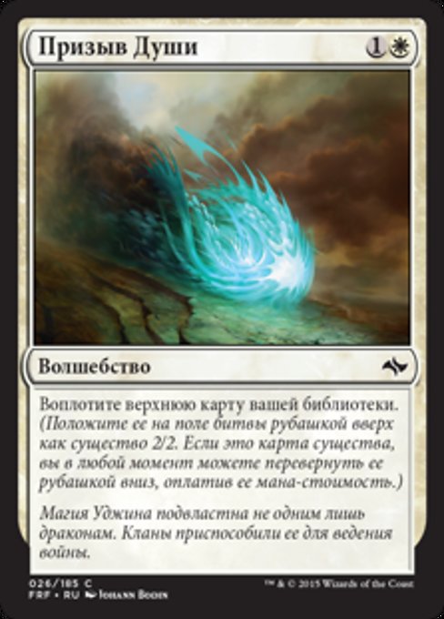 ![]() Variations— Parts— | Invocaciones de almaManifiesta la primera carta de tu biblioteca. (Ponla en el campo de batalla boca abajo como una criatura 2/2. Ponla boca arriba en cualquier momento por su coste de maná si es una carta de criatura.)