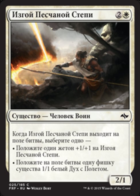 ![]() Variations— Parts— | Reietto delle Steppe Sabbiose2 / 1 Quando il Reietto delle Steppe Sabbiose entra nel campo di battaglia, scegli uno — • Metti un segnalino +1/+1 sul Reietto delle Steppe Sabbiose. • Metti sul campo di battaglia una pedina creatura Spirito 1/1 bianca con volare.