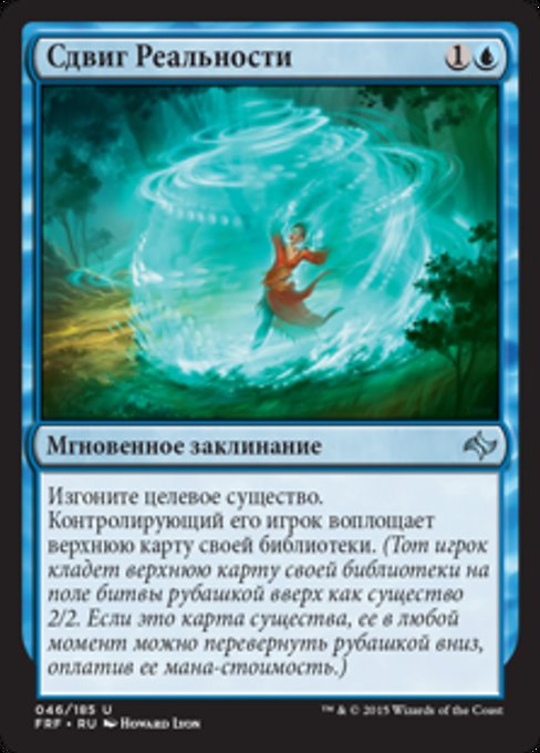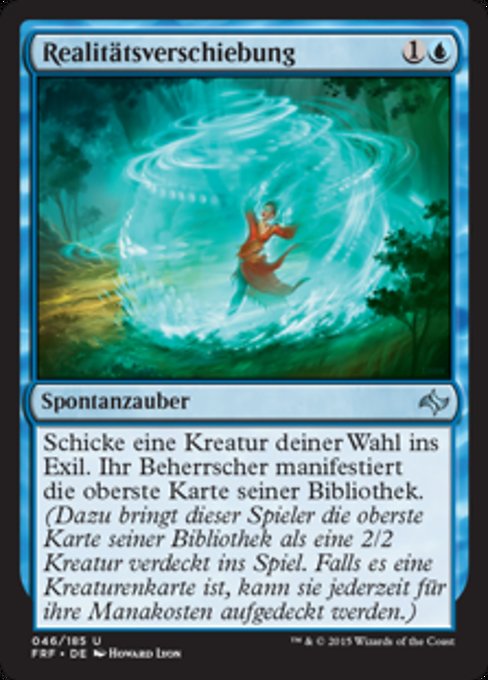 |  Variations— Parts— | Mutamento della RealtàEsilia una creatura bersaglio. Il suo controllore manifesta la prima carta del suo grimorio. (Quel giocatore mette la prima carta del suo grimorio sul campo di battaglia a faccia in giù come una creatura 2/2. Se è una carta creatura, può essere girata a faccia in su in qualsiasi momento pagando il suo costo di mana.)