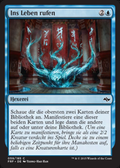 |  Variations— Parts— | Origine dalla ScritturaGuarda le prime due carte del tuo grimorio. Manifesta una di quelle carte, poi metti l'altra in cima o in fondo al tuo grimorio. (Per manifestare una carta, mettila sul campo di battaglia a faccia in giù come una creatura 2/2. Se è una carta creatura, girala a faccia in su in qualsiasi momento pagando il suo costo di mana.)