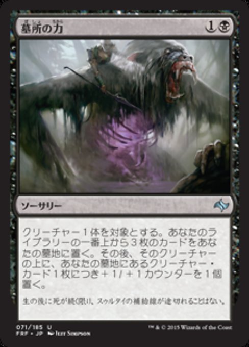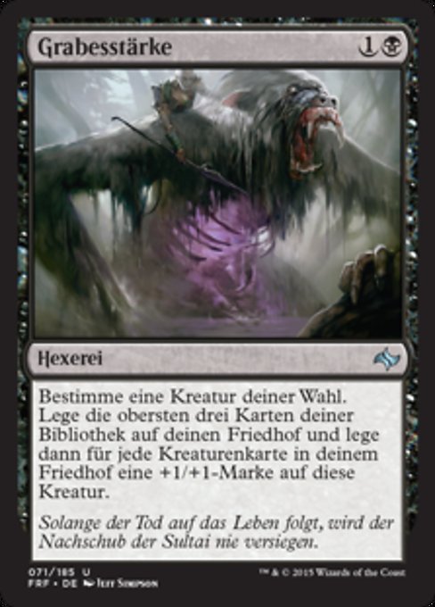 |  Variations— Parts— | Forza del SepolcroScegli una creatura bersaglio. Metti nel tuo cimitero le prime tre carte del tuo grimorio, poi metti un segnalino +1/+1 su quella creatura per ogni carta creatura nel tuo cimitero.
