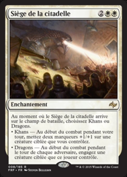 |  Variations— Parts— | 城塞の包囲城塞の包囲が戦場に出るに際し、カンか龍かを選ぶ。 • カン ― あなたのターンの戦闘の開始時に、あなたがコントロールするクリーチャー1体を対象とし、それの上に+1/+1カウンターを2個置く。 • 龍 ― 各対戦相手のターンの戦闘の開始時に、そのプレイヤーがコントロールするクリーチャー1体を対象とし、それをタップする。