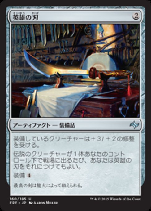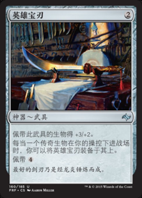 |  Variations— Parts— | 英雄寶刃佩帶此武具的生物得+3/+2。 每當一個傳奇生物在你的操控下進戰場時,你可以將英雄寶刃裝備於其上。 佩帶