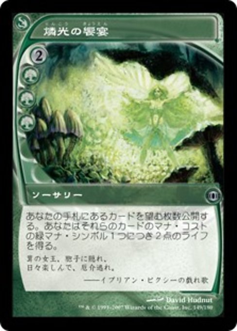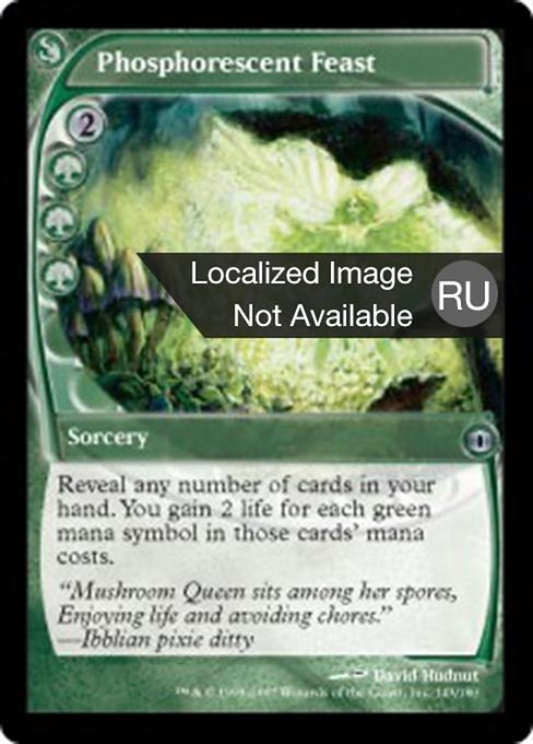 ![]() Variations— Parts— | Phosphorescent FeastChroma — Reveal any number of cards in your hand. You gain 2 life for each green mana symbol in those cards' mana costs.