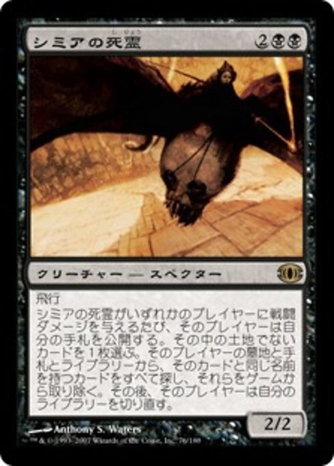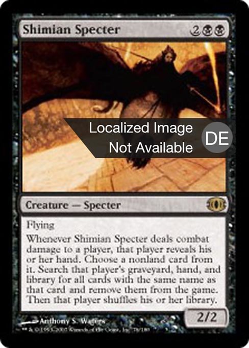 Siempre que el Espectro shimiano haga daño de combate a un jugador, ese jugador muestra su mano. Elige de ahí una carta que no sea tierra. Busca en el cementerio, mano y biblioteca de ese jugador todas las cartas con el mismo nombre que esa carta y remuévelas del juego. Luego ese jugador baraja su biblioteca.