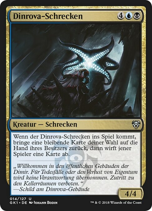 ![]() Variations— Parts— | Dinrova Horror4 / 4 When this creature enters, return target permanent to its owner's hand, then that player discards a card.