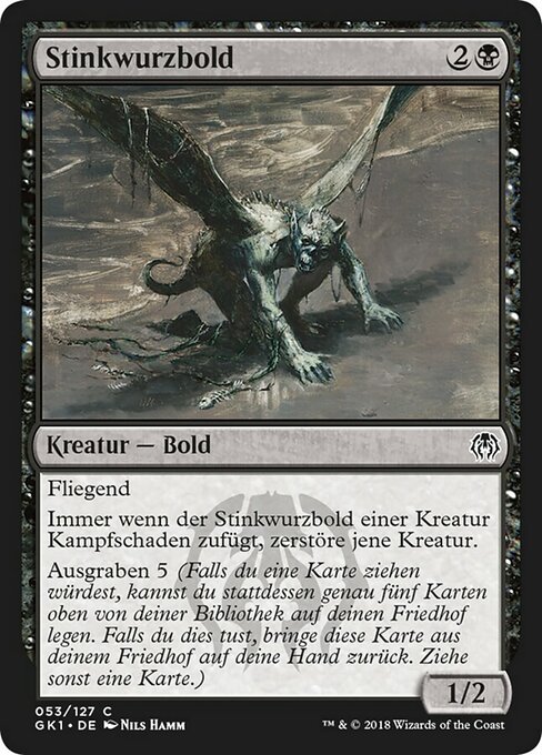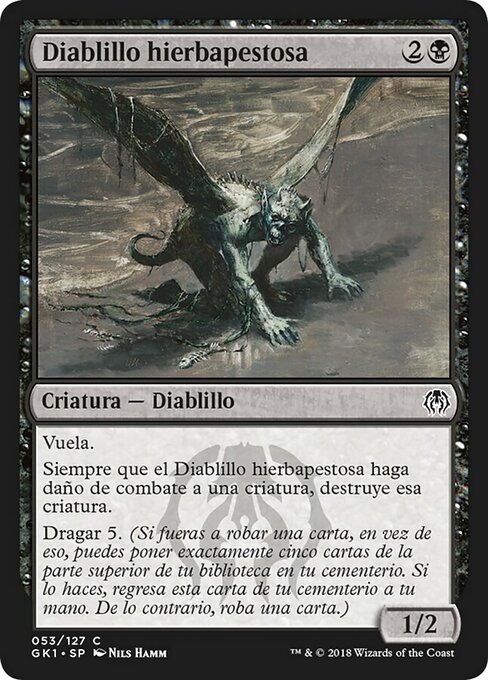 |  Variations— Parts— | Stinkweed Imp1 / 2 Flying Whenever this creature deals combat damage to a creature, destroy that creature. Dredge 5 (If you would draw a card, you may mill five cards instead. If you do, return this card from your graveyard to your hand.)