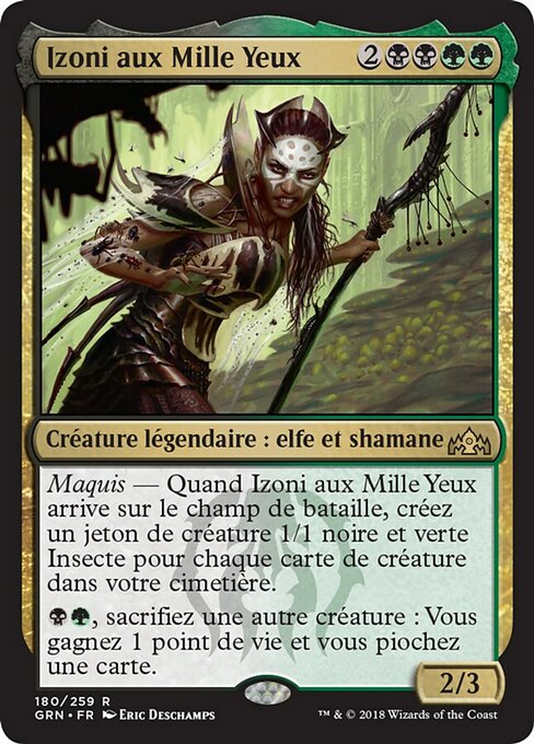 ![]() Variations— Parts— | Izoni aux Mille Yeux2 / 3 Maquis — Quand Izoni aux Mille Yeux arrive sur le champ de bataille, créez un jeton de créature 1/1 noire et verte Insecte pour chaque carte de créature dans votre cimetière.