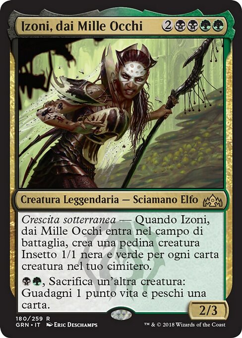 |  Variations— Parts— | Izoni, dai Mille Occhi2 / 3 Crescita sotterranea — Quando Izoni, dai Mille Occhi entra nel campo di battaglia, crea una pedina creatura Insetto 1/1 nera e verde per ogni carta creatura nel tuo cimitero.