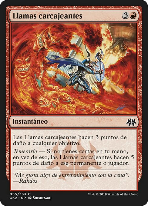 ![]() Variations— Parts— | Cackling FlamesCackling Flames deals 3 damage to any target. Hellbent — Cackling Flames deals 5 damage instead if you have no cards in hand.