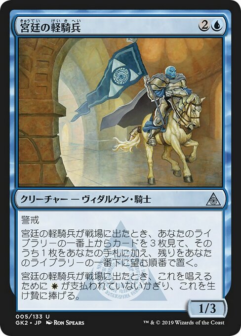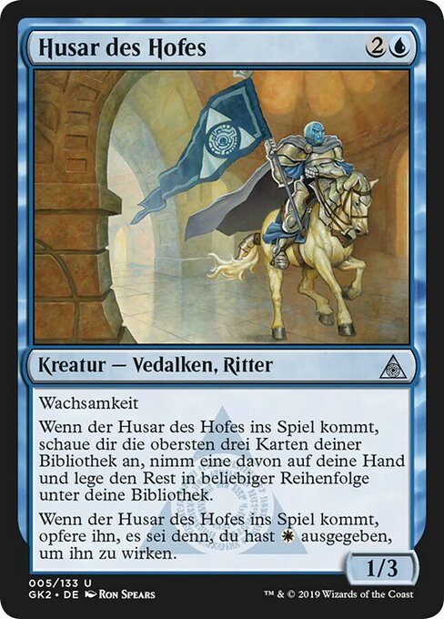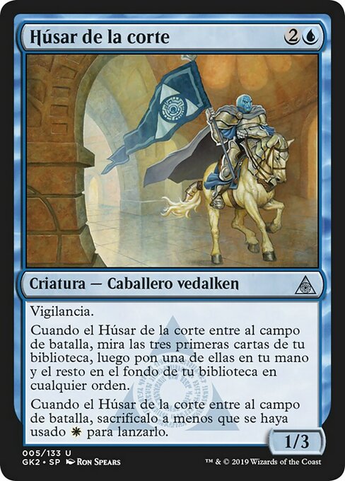 |  Variations— Parts— | Hussard de la cour1 / 3 Vigilance Quand le Hussard de la cour arrive sur le champ de bataille, regardez les trois cartes du dessus de votre bibliothèque, puis mettez l'une d'entre elles dans votre main et le reste au-dessous de votre bibliothèque, dans n'importe quel ordre. Quand le Hussard de la cour arrive sur le champ de bataille, sacrifiez-le à moins que