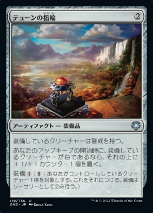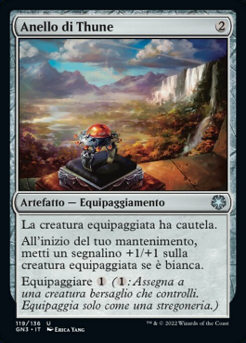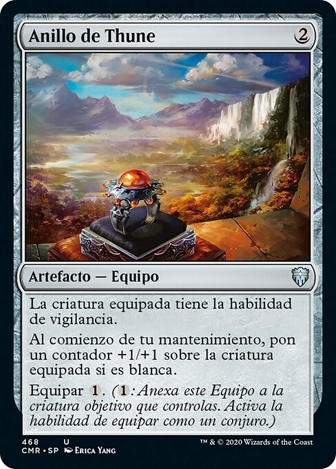 |  Variations— Parts— | Anillo de ThuneLa criatura equipada tiene la habilidad de vigilancia. Al comienzo de tu mantenimiento, pon un contador +1/+1 sobre la criatura equipada si es blanca. Equipar