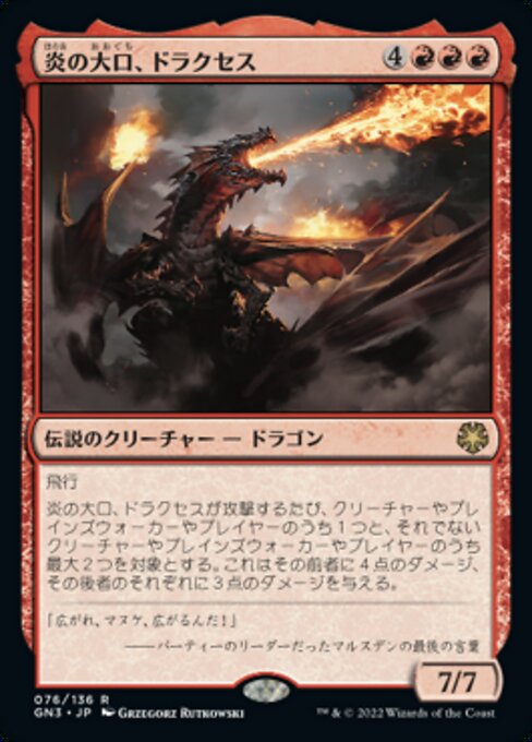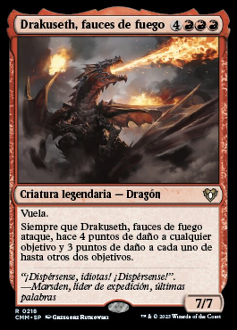 ![]() Variations— Parts— | Drakuseth, fauces de fuego7 / 7 Vuela. Siempre que Drakuseth, fauces de fuego ataque, hace 4 puntos de daño a cualquier objetivo y 3 puntos de daño a cada uno de hasta otros dos objetivos.
