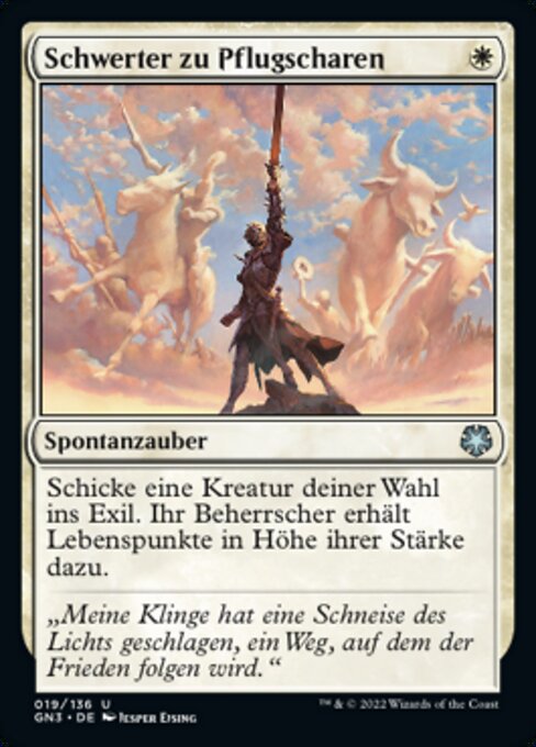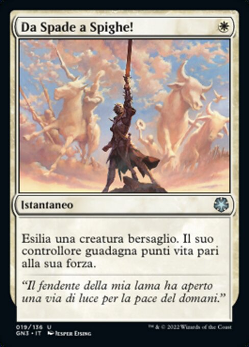 |  Variations— Parts— | Da Spade a Spighe!Esilia una creatura bersaglio. Il suo controllore guadagna punti vita pari alla sua forza.