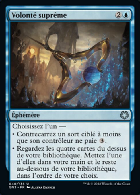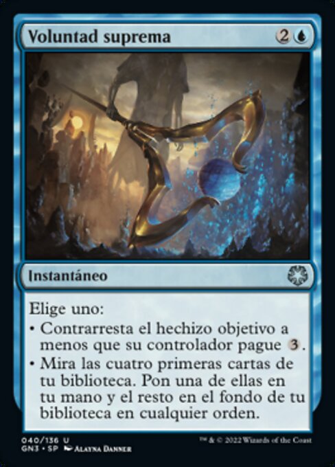 ![]() Variations— Parts— | Volontà SupremaScegli uno — • Neutralizza una magia bersaglio a meno che il suo controllore non paghi • Guarda le prime quattro carte del tuo grimorio. Aggiungine una alla tua mano e metti le altre in fondo al tuo grimorio in qualsiasi ordine.
