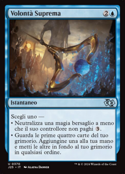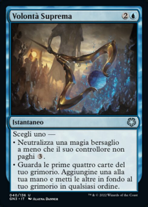 |  Variations— Parts— | Volontà SupremaScegli uno — • Neutralizza una magia bersaglio a meno che il suo controllore non paghi • Guarda le prime quattro carte del tuo grimorio. Aggiungine una alla tua mano e metti le altre in fondo al tuo grimorio in qualsiasi ordine.