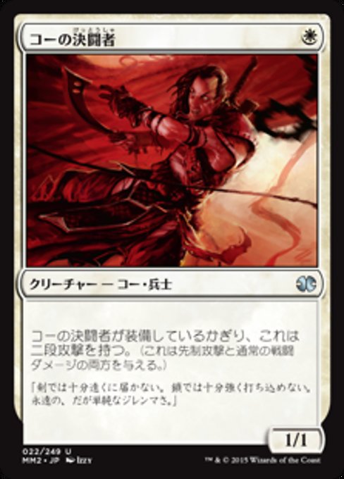 ![]() Variations— Parts— | コーの決闘者1 / 1 コーの決闘者に装備品がついているかぎり、これは二段攻撃を持つ。