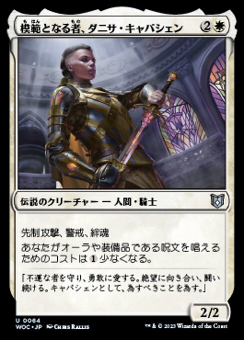 ![]() Variations— Parts— | 模範となる者、ダニサ・キャパシェン2 / 2 先制攻撃、警戒、絆魂 あなたがオーラや装備品である呪文を唱えるためのコストは