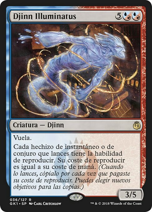 |  Variations— Parts— | Djinn Illuminatus3 / 5 ( Vuela. Cada hechizo instantáneo o conjuro que juegues tienen la habilidad de reproducir. Su coste de reproducir es igual a su coste de maná. (Cuando lo juegues, cópialo por cada vez que pagaste su coste de reproducir. Puedes elegir nuevos objetivos para la copia.)