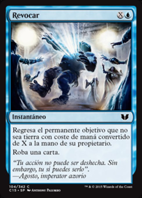 |  Variations— Parts— | RevocarRegresa el permanente objetivo que no sea tierra con coste de maná convertido de X a la mano de su propietario. Roba una carta.