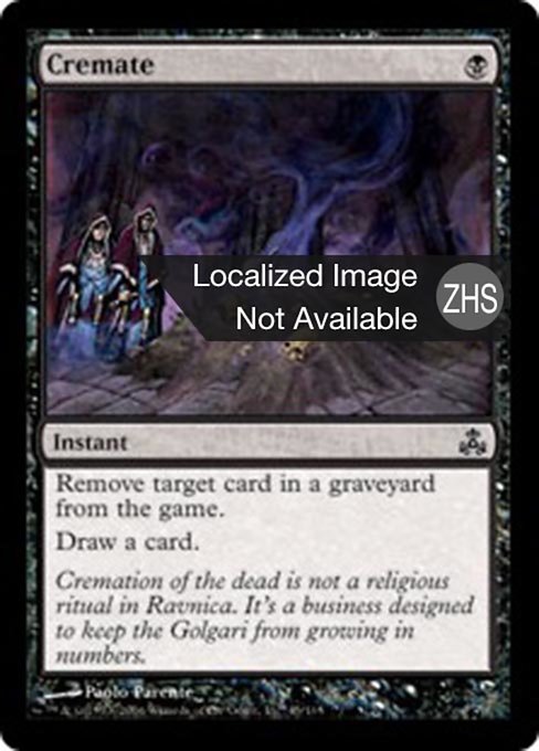 LegalitiesLegal Duel Penny Predh Legacy Modern Pauper Pioneer Vintage Commander Premodern Oathbreaker Paupercommander Not Legal Brawl Future Alchemy Historic Standard Timeless Gladiator Oldschool Standardbrawl RulingsIf the target card is no longer in the graveyard when Cremate tries to resolve, it won't resolve and none of its effects will happen. You won't draw a card.