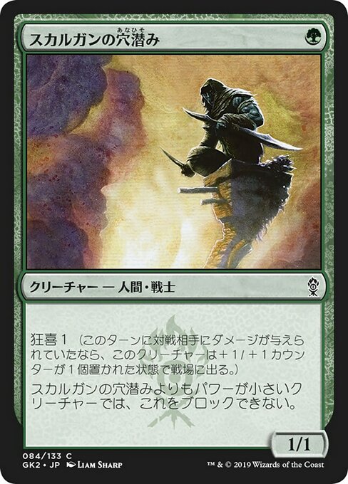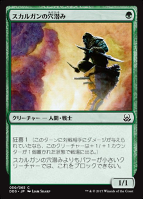 ![]() Variations— Parts— | スカルガンの穴潜み1 / 1 狂喜 1 (このターン、いずれかの対戦相手にダメージが与えられている場合、このクリーチャーは+1/+1カウンターが1個置かれた状態で場に出る) スカルガンの穴潜みよりもパワーの小さいクリーチャーは、スカルガンの穴潜みのブロックに参加できない。