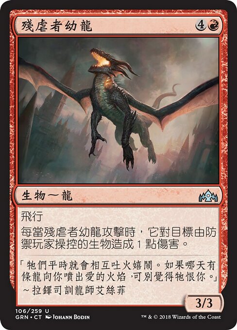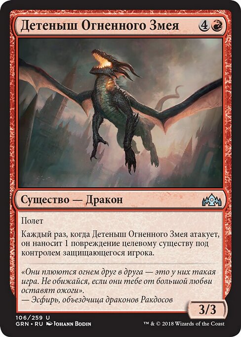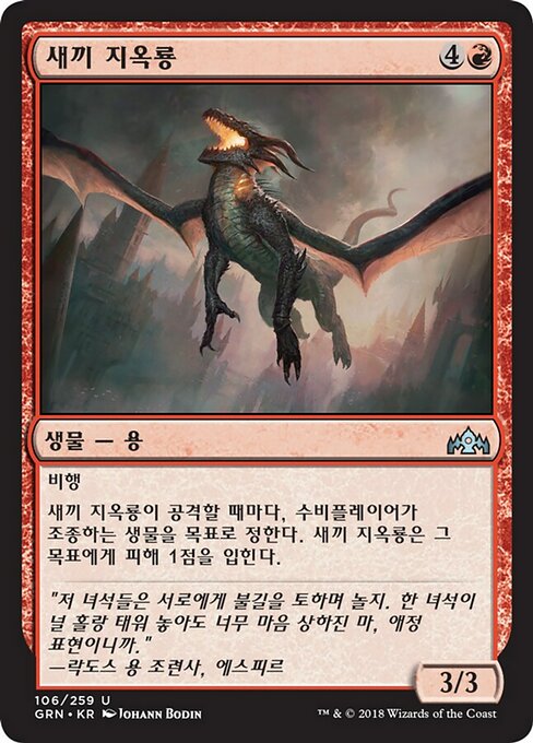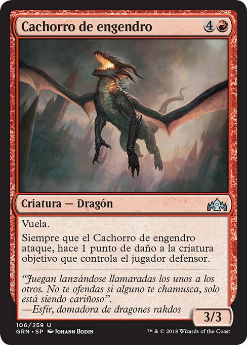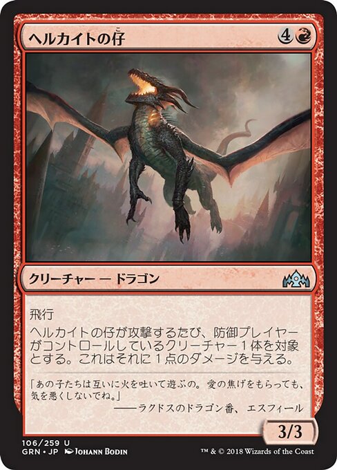 |  Variations— Parts— | Höllendrachen-Welpe3 / 3 Fliegend Immer wenn der Höllendrachen-Welpe angreift, fügt er einer Kreatur deiner Wahl, die der verteidigende Spieler kontrolliert, 1 Schadenspunkt zu.