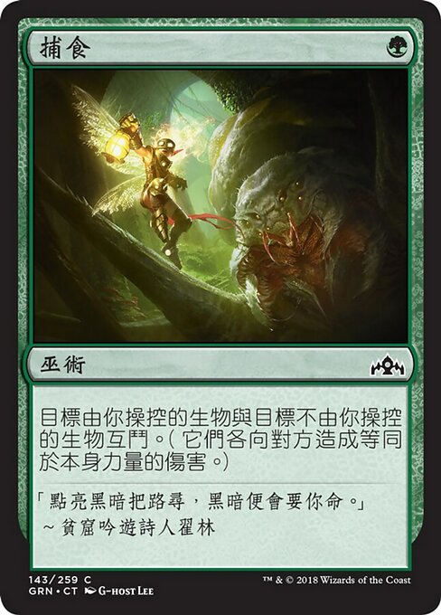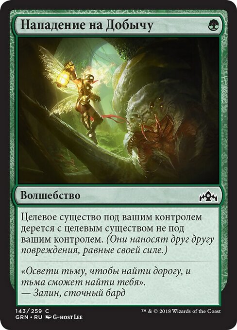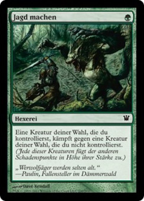 |  Variations— Parts— | Jagd machenEine Kreatur deiner Wahl, die du kontrollierst, kämpft gegen eine Kreatur deiner Wahl, die du nicht kontrollierst. (Jede der Kreaturen fügt der anderen Schadenspunkte in Höhe ihrer Stärke zu.)