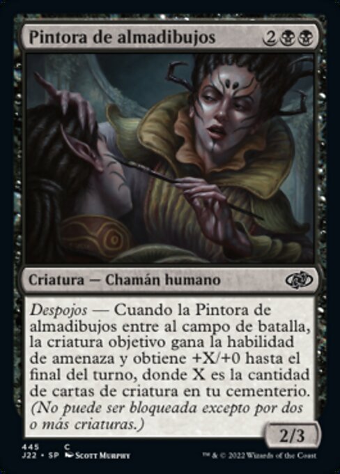|  Variations— Parts— | Pintora de almadibujos2 / 3 Despojos — Cuando la Pintora de almadibujos entre al campo de batalla, la criatura objetivo gana la habilidad de amenaza y obtiene +X/+0 hasta el final del turno, donde X es la cantidad de cartas de criatura en tu cementerio. (No puede ser bloqueada excepto por dos o más criaturas.)