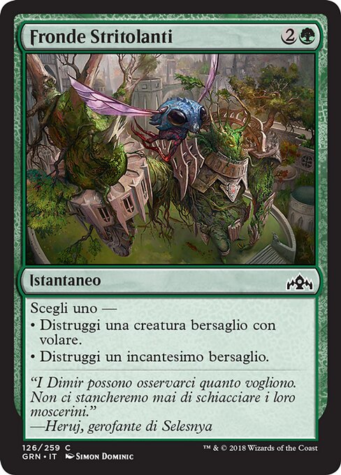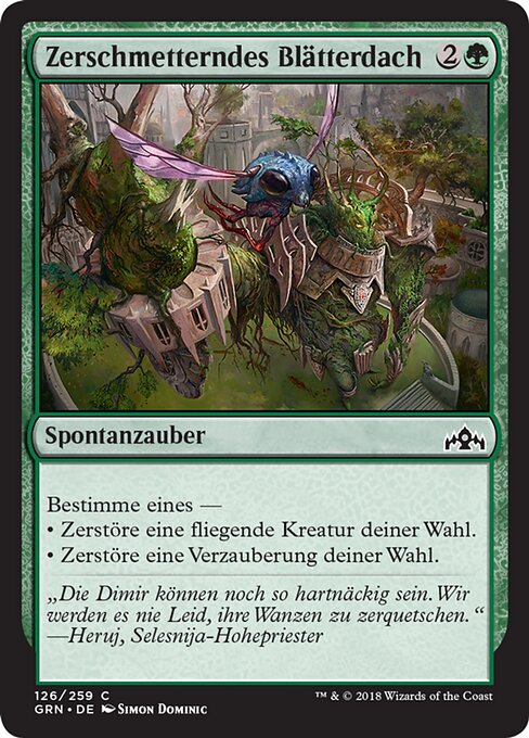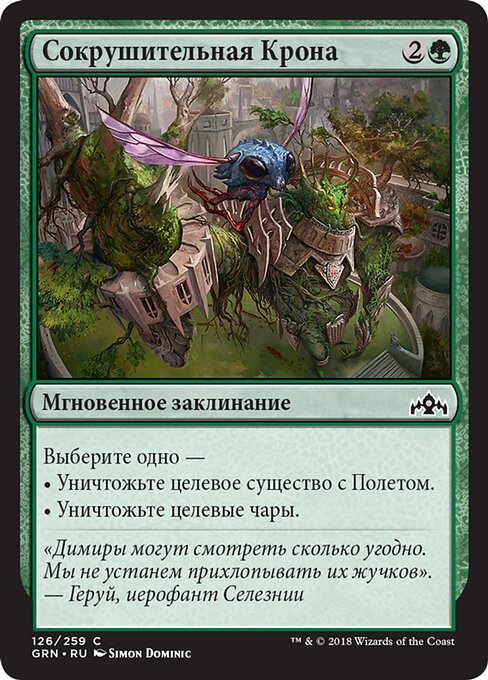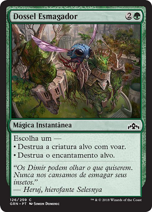 |  Variations— Parts— | Canopée écrasanteChoisissez l'un — • Détruisez la créature avec le vol ciblée. • Détruisez l'enchantement ciblé.