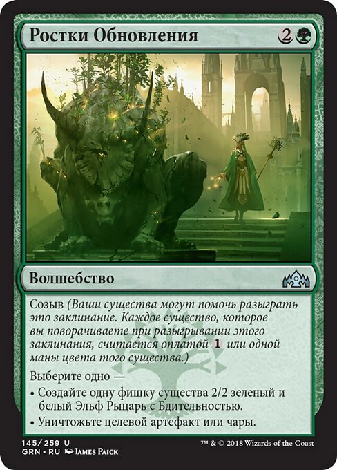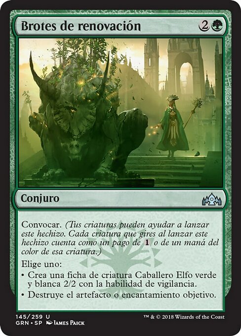 ![]() Variations— Parts— | Renouveau bourgeonnantConvocation (Vos créatures peuvent aider à lancer ce sort. Chaque créature que vous engagez en lançant ce sort paie Choisissez l'un — • Créez un jeton de créature 2/2 verte et blanche Elfe et Chevalier avec la vigilance. • Détruisez l'artefact ciblé ou l'enchantement ciblé.