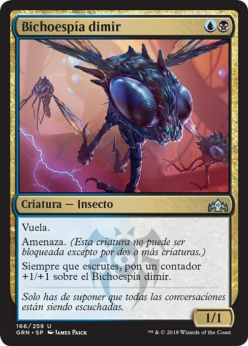 |  Variations— Parts— | Insecte-espion de Dimir1 / 1 Vol Menace (Cette créature ne peut pas être bloquée excepté par deux créatures ou plus.) À chaque fois que vous surveillez, mettez un marqueur +1/+1 sur l'Insecte-espion de Dimir.