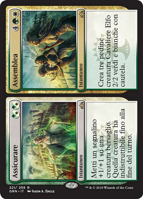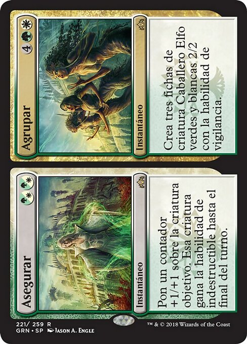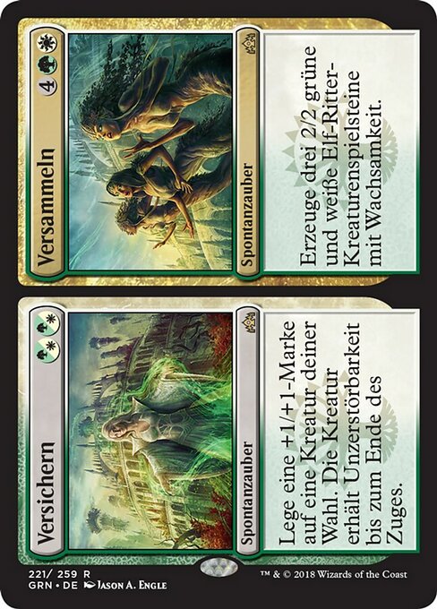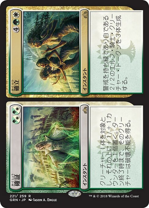 確立警戒を持ち緑であり白である2/2のエルフ・騎士・クリーチャー・トークンを3体生成する。