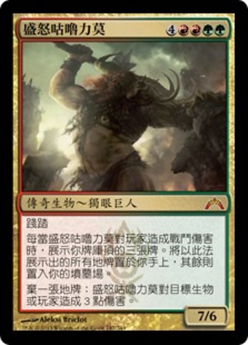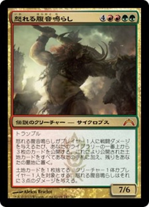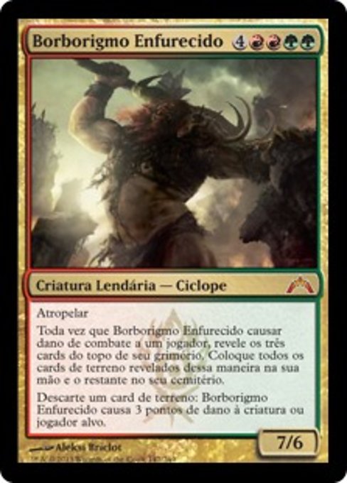 |  Variations— Parts— | Borborygmos Enraged7 / 6 Trample Whenever Borborygmos Enraged deals combat damage to a player, reveal the top three cards of your library. Put all land cards revealed this way into your hand and the rest into your graveyard. Discard a land card: Borborygmos Enraged deals 3 damage to any target.