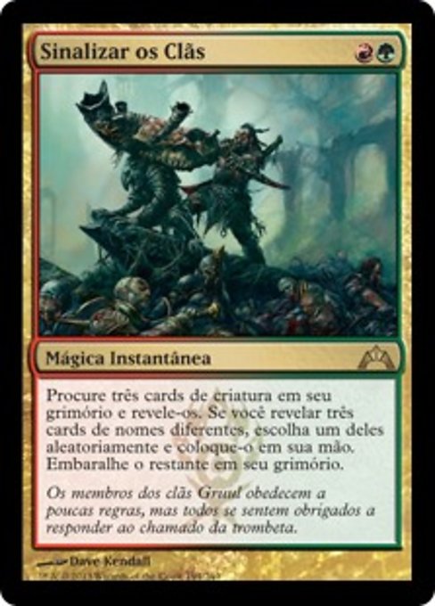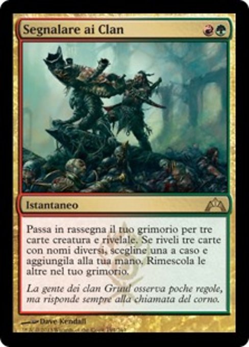 |  Variations— Parts— | Signal the ClansSearch your library for three creature cards and reveal them. If you reveal three cards with different names, choose one of them at random and put that card into your hand. Shuffle the rest into your library.