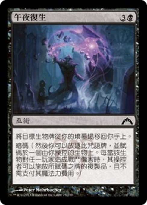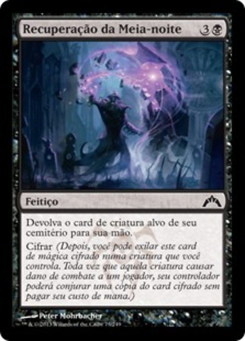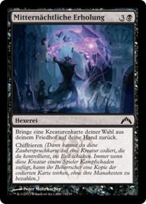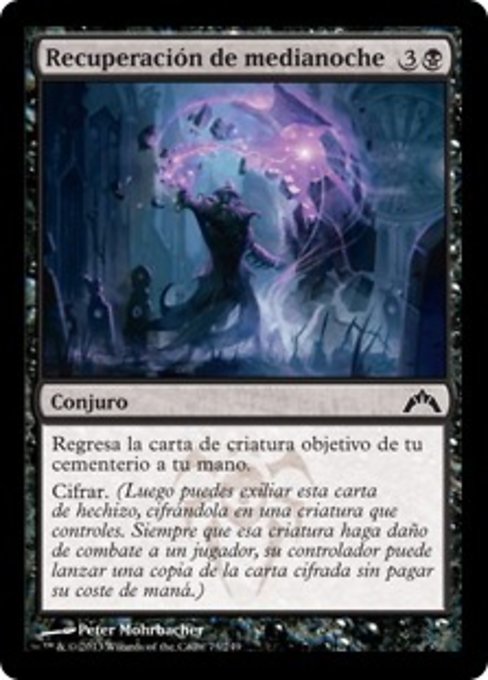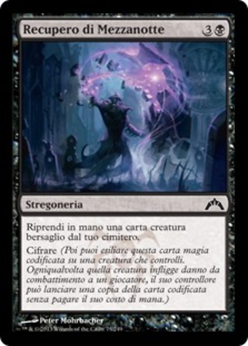 ![]() Variations— Parts— | Midnight RecoveryReturn target creature card from your graveyard to your hand. Cipher (Then you may exile this spell card encoded on a creature you control. Whenever that creature deals combat damage to a player, its controller may cast a copy of the encoded card without paying its mana cost.)