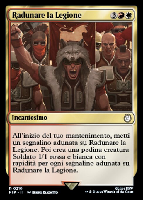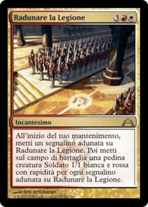 |  Variations— Parts— | Radunare la LegioneAll'inizio del tuo mantenimento, metti un segnalino adunata su Radunare la Legione. Poi metti sul campo di battaglia una pedina creatura Soldato 1/1 bianca e rossa con rapidità per ogni segnalino adunata su Radunare la Legione.