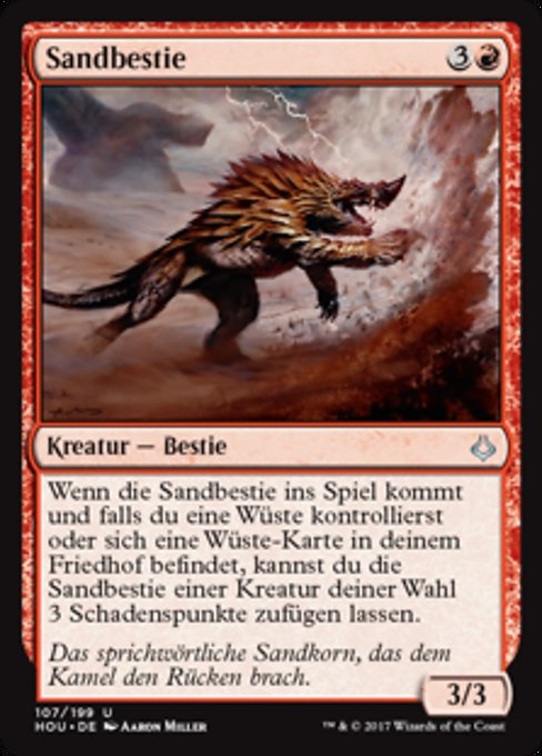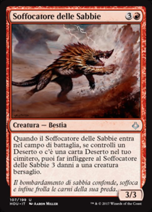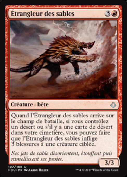 ![]() Variations— Parts— | Sand Strangler3 / 3 When this creature enters, if you control a Desert or there is a Desert card in your graveyard, you may have this creature deal 3 damage to target creature.