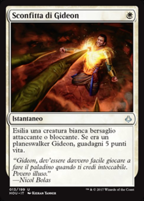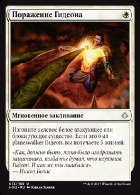 ![]() Variations— Parts— | Gideon's DefeatExile target white creature that's attacking or blocking. If it was a Gideon planeswalker, you gain 5 life.