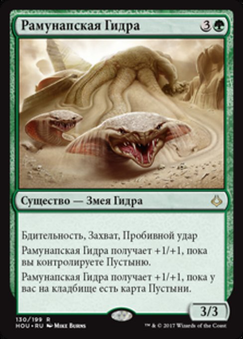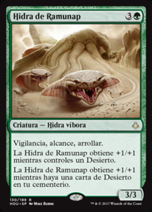 LegalitiesLegal Duel Penny Legacy Modern Pioneer Vintage Commander Oathbreaker Not Legal Brawl Predh Future Pauper Alchemy Historic Standard Timeless Gladiator Oldschool Premodern Standardbrawl Paupercommander RulingsUnlike other cards in this set that care only whether you control a Desert or there is a Desert card in your graveyard, Ramunap Hydra's abilities reward you for meeting both conditions. If you control one or more Deserts and have one or more Desert cards in your graveyard, it'll get +2/+2.