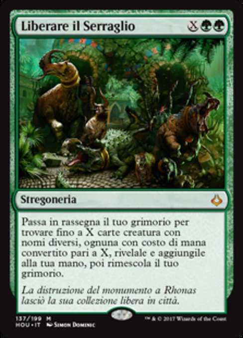 ![]() Variations— Parts— | Uncage the MenagerieSearch your library for up to X creature cards with different names that each have mana value X, reveal them, put them into your hand, then shuffle.
